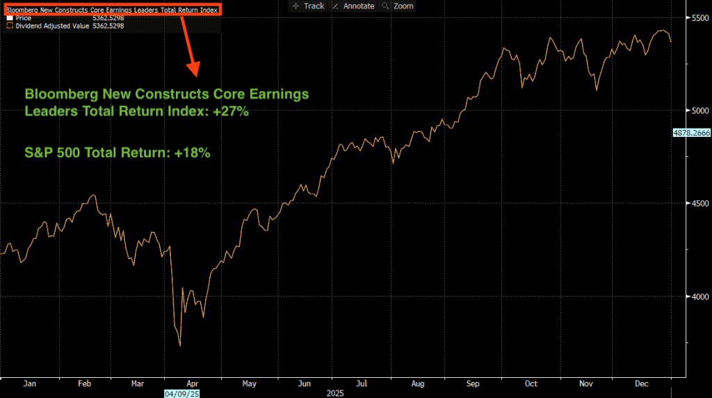 The Core Earnings Leaders Index (BCORET) Beat the S&P 500 by 897 Basis Points in 2025.