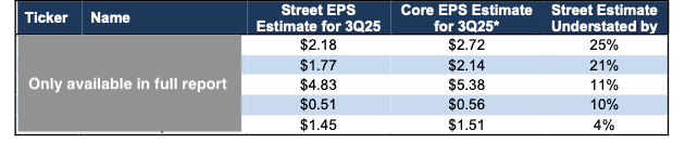 Figure 4 in the full report shows the S&P 500 companies with an Attractive or Very Attractive Stock Rating that are likely to beat calendar 3Q25 earnings because their Street EPS estimates are understated. Because investors and analysts tend to anchor their earnings projections to historical results, errors in historical Street EPS lead to errors in Street EPS estimates.