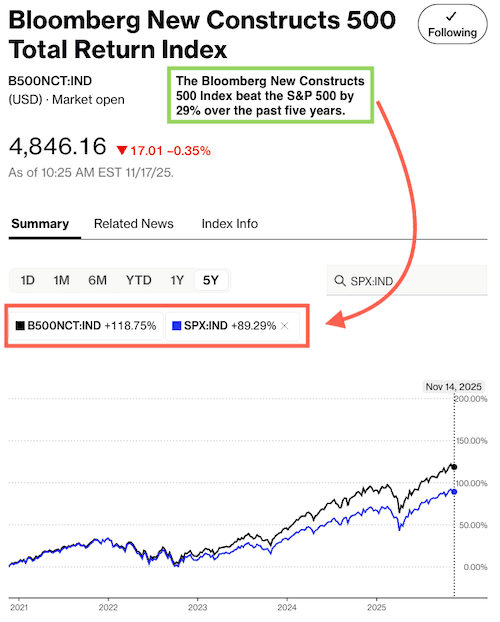 Figure 4: Bloomberg New Constructs 500 Index Strongly Outperforms the S&P 500: Last Five Years