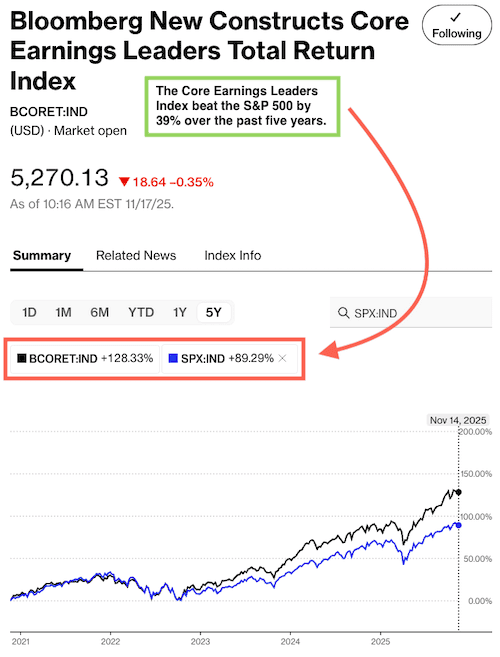 The Bloomberg New Constructs Core Earnings Leaders Index, which allocates based on Earnings Capture and Core Earnings, beat the S&P 500 by over 39% over the past five years. The Index (ticker: BCORET:IND) was up 128% while the S&P 500 was up 89%.
