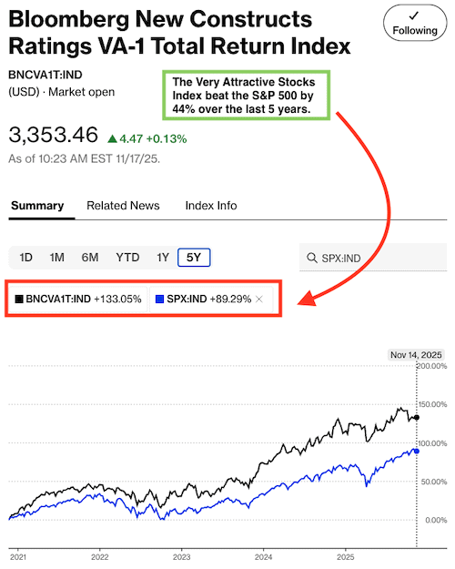 The “Very Attractive Stocks” Index, which allocates to stocks that get a Very Attractive rating, beat the S&P 500 by 44% over the last five years. Bloomberg’s official name for the index is Bloomberg New Constructs Ratings VA-1Index (ticker: BNCVAT1T:IND). Figure 3 shows it was up 133% while the S&P 500 was up 89%.