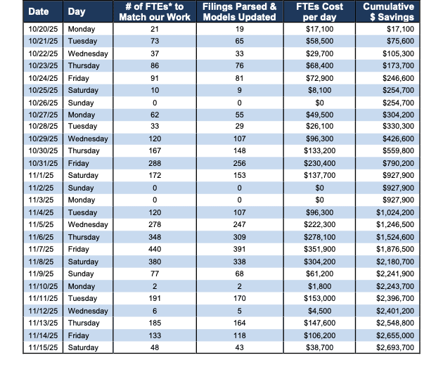 During 3Q25 footnotes season, we parsed 2,993 10-Q and 10-K filings and created $2,693,700[1] of value for clients. See details in Figure 1.
