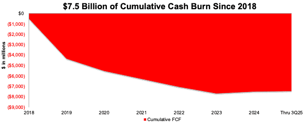 This company certainly knows how to burn cash. From 2018 through 3Q25, the company burned through a cumulative $7.5 billion (78% of enterprise value) in free cash flow (FCF).