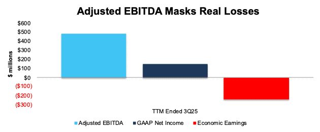 In the TTM ended 3Q25, the company reported adjusted EBITDA of $488 million and GAAP net income of $151 million. Over the same time, its economic earnings were -$244 million. Figure 3 shows the discrepancy between the three earnings metrics.