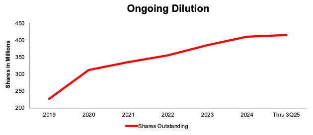 The company’s shares outstanding have increased YoY in every year since its IPO. Per Figure 5, the company’s shares outstanding increased from 228 million in 2019 to 415 million in 3Q25.