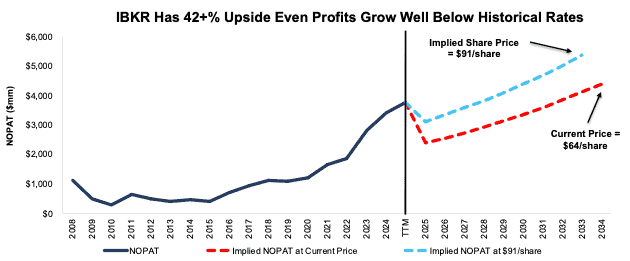 the stock would be worth at least $91/share today – a 42% upside to the current price. In this scenario, Interactive Brokers’ NOPAT grows just 5% compounded annually from 2025 through 2034. Contact us for the math behind this reverse DCF scenario.