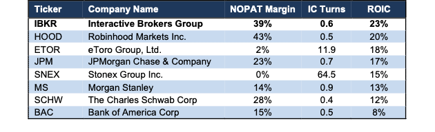 Interactive Brokers has the highest ROIC and the second highest NOPAT margin among publicly traded peers, which include Robinhood (HOOD), eToro (ETOR), JPMorgan (JPM), Charles Schwab (SCHW), and more. See Figure 7.