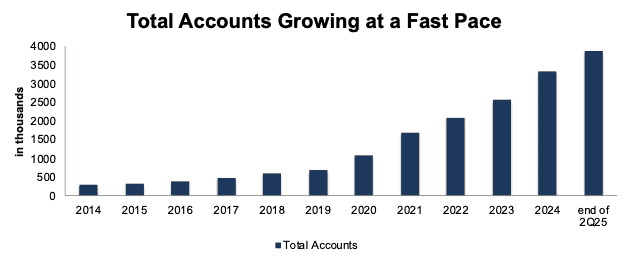 The company’s total accounts grew from 281 thousand in 2014 to 3.9 million at the end of 2Q25. The total accounts grew 37% and 28% compounded annually over the last 5- and 10-years, respectively. See Figure 2.