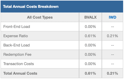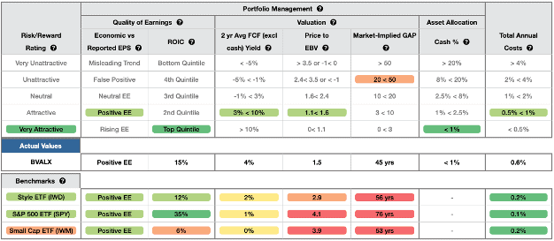 - BVALX’s holdings generate positive economic earnings, same as IWD and SPY.