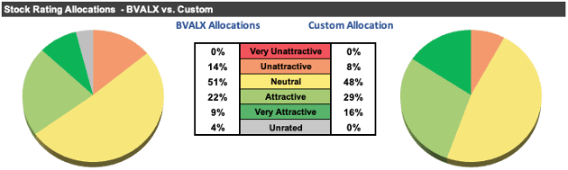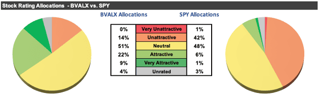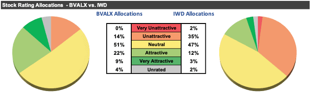 Through this rigorous analysis, we find that BVALX allocates 31% of its assets to Attractive-or-better rated stocks compared to just 15% for IWD. On the flip side, BVALX allocates just 14% of its assets to Unattractive-or-worse rated stocks compared to 37% for IWD.
