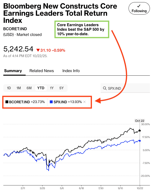 The Bloomberg New Constructs Core Earnings Leaders Index tracks the performance of the top 100 companies that have high Earnings Capture based on our proprietary Core Earnings, which removes unusual gains and losses found in the footnotes and MD&A in company filings. The Earnings Capture metric equals Core Earnings minus reported earnings.