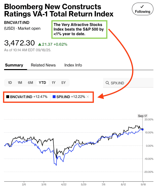 The Bloomberg New Constructs Ratings VA-1 Index, aka the “Very Attractive Stocks Index”, tracks the stocks in the Bloomberg 1000 Index that get our Very Attractive Rating. In other words, it’s an index of nearly all our Very Attractive-Rated stocks.