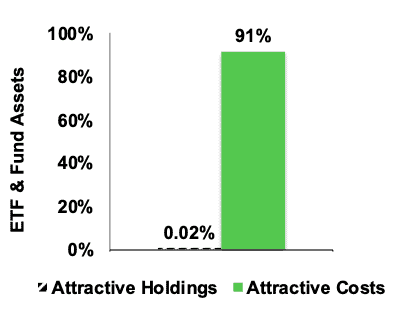 Figure 1 shows that 91% of fund assets are in ETFs and mutual funds with low costs but nearly no assets are in ETFs and mutual funds with attractive holdings. This discrepancy is eye-opening.