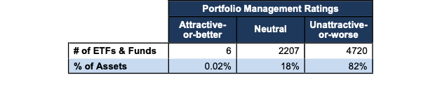 Figure 2 shows investors are not putting enough money into ETFs and mutual funds with high-quality holdings. Only six out of 6,933 (<1%) ETFs and mutual funds earn an Attractive-or-better Portfolio Management Rating. 99% of assets are in funds that do not justify their costs and overcharge investors for poor portfolio management.