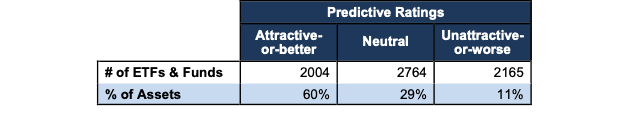 Investors are good at picking cheap funds. We want them to be better at picking funds with good stocks. Both are required to maximize success. Our predictive fund ratings make finding such funds easier than ever. A fund’s predictive rating is based on its holdings, its total costs, and how it ranks when compared to the universe of over 7,000 ETFs and mutual funds we cover.