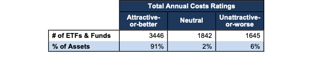 Figure 3 shows that investors successfully find low-cost funds because 91% of assets are held in ETFs and mutual funds that have Attractive-or-better rated total annual costs (TAC), our apples-to-apples measure of the all-in cost of investing in any given fund.
