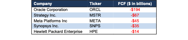 Perhaps unsurprisingly, Meta and Oracle (ORCL) are two of the five largest contributors to the sector’s FCF decline. Over the TTM, Meta and Oracle burned -$67 billion and -$194 billion in FCF, respectively.