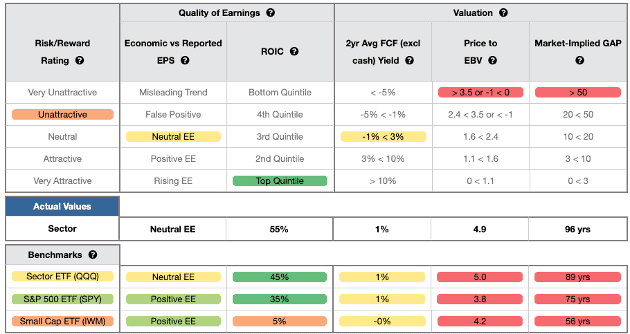 The Technology sector is more profitable than the S&P 500 (as measured by ROIC), but the stocks in the sector are much more expensive, as measured by the higher PEBV and market-implied GAP.