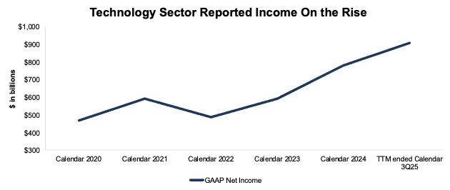 The five most profitable companies, Alphabet (GOOGL), Apple (AAPL), Microsoft (MSFT), NVIDIA (NVDA), and Meta (META), generated a combined $499 billion in GAAP net income over the TTM ended calendar 3Q25, or 55% of the entire sector’s GAAP net income. These five stocks are <1% of the stocks in the entire Technology sector.