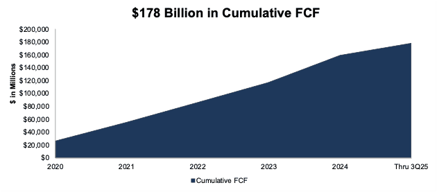 The company generated a cumulative $178 billion (63% of enterprise value) in free cash flow (FCF) from 2020 through 3Q25. See Figure 6. Over the same time, the company returned $107 billion to shareholders through dividends and repurchases.