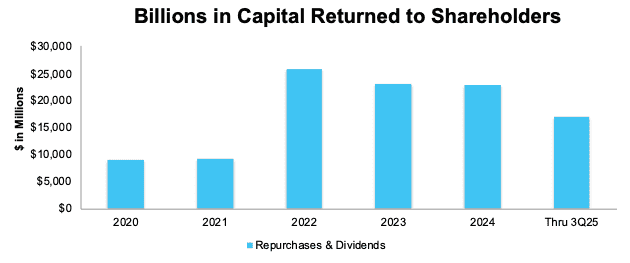 The company also returns additional capital to shareholders via share repurchases. The company repurchased $14.6 billion and $13.9 billion of shares in 2023 and 2024, respectively. In the first nine months of 2025, the company repurchased $10.5 billion of shares. In its 4Q25 earnings release, the company announced a $3.5 billion repurchase program, which it expects to complete by Q1 results in May 2026. This announcement marks the 17th consecutive quarter in which the company announced $3 billion or more in buybacks.