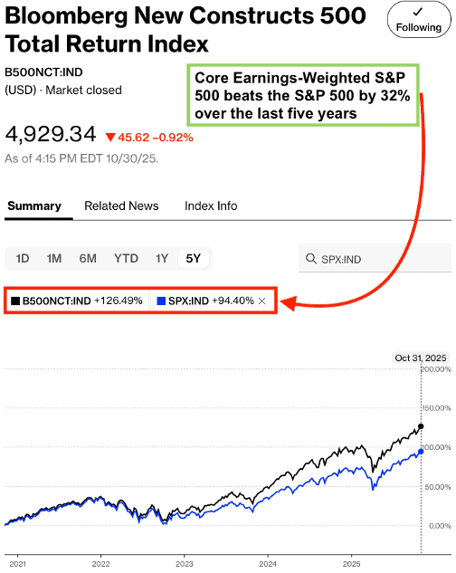 The Bloomberg New Constructs 500 Total Return Index (B500NCT:IND) offers real-time proof of the alpha that Core Earnings generates. The index beat the S&P 500 by over 32% over the last five years, rising 126% while the S&P 500 was up 94%. Provided by Bloomberg, this index takes the top 500 stocks by market cap and weights stocks based on Earnings Capture[1] instead of weighting each stock by market cap.