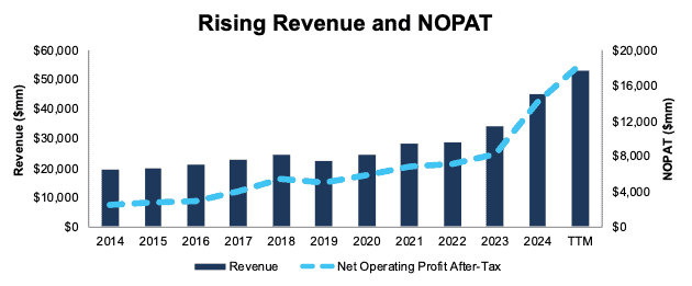 Not only does Eli Lilly generate the top-tier Core Earnings, the company has consistently grown its revenue, net operating profit after tax (NOPAT), and return on invested capital (ROIC).