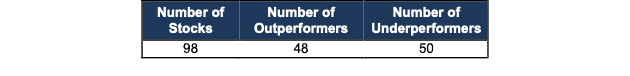 Our “Core-Earnings Weighted S&P 500” Index, which weights the largest 500 U.S. companies by Core Earnings instead of market cap, beat the S&P 500 by 31% over the past five years. Bloomberg’s official name for the index is Bloomberg New Constructs 500 Total Return Index (ticker: B500NCT:IND). Figure 6 shows it was up 124% while the S&P 500 was up 93%.