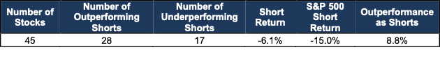 Our Focus List Stocks: Short Model Portfolio[1], the best of our Danger Zone picks, outperformed the S&P 500 as a short by 8.8% (-6.1% vs. -15.0% for the S&P 500) in 2025. See Figure 2.