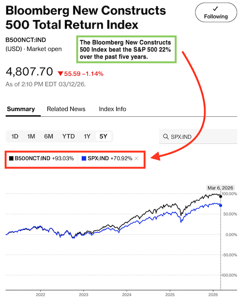 Figure 4: Bloomberg New Constructs 500 Index Strongly Outperforms the S&P 500: Last Five Years