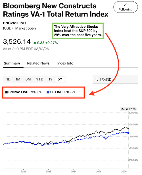 The “Very Attractive Stocks” Index, which allocates to stocks that get a Very Attractive rating by our AI Agent for Investing, beat the S&P 500 by 29% over the last five years. Bloomberg’s official name for the index is Bloomberg New Constructs Ratings VA-1Index (ticker: BNCVAT1T:IND). Figure 3 shows it was up 100% while the S&P 500 was up 71%.