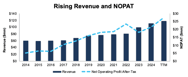 First United Corp (FUNC: $36/share) has grown revenue and net operating profit after tax (NOPAT) by 7% and 18% compounded annually since 2014, respectively. First United’s NOPAT margin increased from 8% in 2014 to 23% in the trailing-twelve months (TTM), while its invested capital turns rose from 0.4 to 0.5 over the same time. Rising NOPAT margins and invested capital turns drive First United’s return on invested capital (ROIC) from 4% in 2014 to 12% in the TTM.