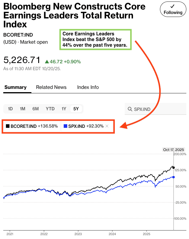 Per Figure 3, the Bloomberg New Constructs Core Earnings Leaders Index beat the S&P 500 by 44% over the past five years. The Index (ticker: BCORET:IND) was up 137% while the S&P 500 was up 92%. See Figure 7 for details.