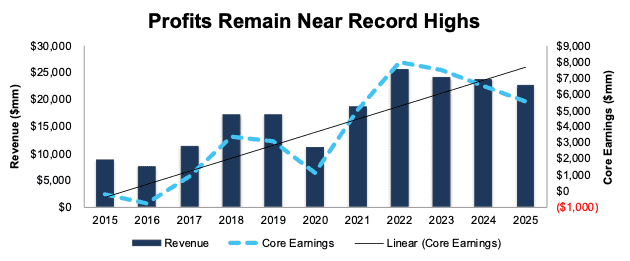 While profits are down from record 2022 levels, the company continues to generate strong Core Earnings. In 2025, the company’s Core Earnings were $5.5 billion, down from 2022 levels, but still nearly five times higher than 2020.