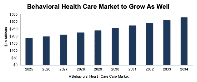 The rise in mental illness ultimately drives higher demand for behavioral health services. Precedence Research forecasts the behavioral health market will grow $185 billion in 2025 to $330 billion in 2034, or 7% compounded annually. See Figure 4.