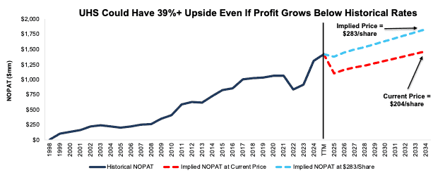 UHS would be worth $204/share today – equal to the current price. In this scenario, Universal Health Services’ NOPAT would grow just 1% compounded annually from 2025 through 2034. For reference, Universal Health Services has grown NOPAT by 6% and 7% compounded annually over the past 5 and 10 years, respectively. Contact us for the math behind this reverse DCF scenario.
