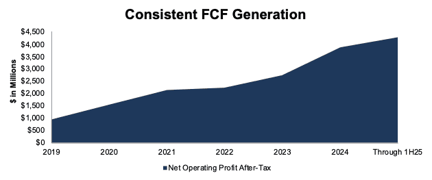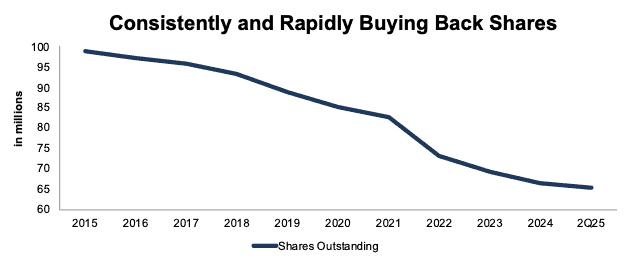 Although the company’s dividend yield is relatively low, it more than makes up for it with its heavy share repurchases. From 2021 through the first half of 2025, the company repurchased $3.7 billion (29% of market cap) of shares.