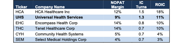 Universal Health Services’ invested capital turns and ROIC rank second highest among publicly traded healthcare system operators. The only company more profitable than Universal Health Services is fellow Long Idea HCA Healthcare (HCA). Other competitors in the comparison include Encompass Health Corp (EHC), Tenet Healthcare (TNT), Community Health Systems (CYH), and Select Medical Holdings (SEM), per Figure 8.