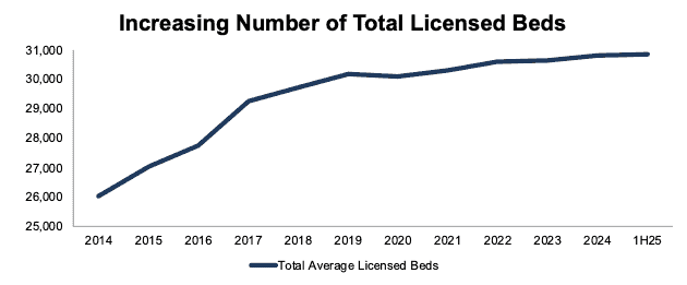 The company’s total average licensed bed count (acute care hospitals beds + behavioral health centers beds) increased from 26,000 in 2014 to nearly 31,000 in the first half of 2025. See Figure 5.