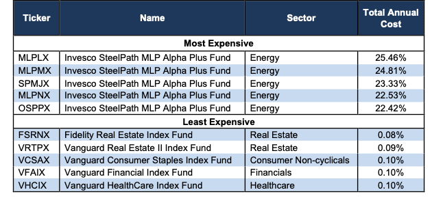 Figure 1 shows Invesco SteelPath MLP Alpha Plus Fund (MLPLX) is the most expensive sector mutual fund and Fidelity Real Estate Index Fund (FSRNX) is the least expensive. Invesco provides all five of the most expensive mutual funds while Vanguard mutual funds are among the cheapest.