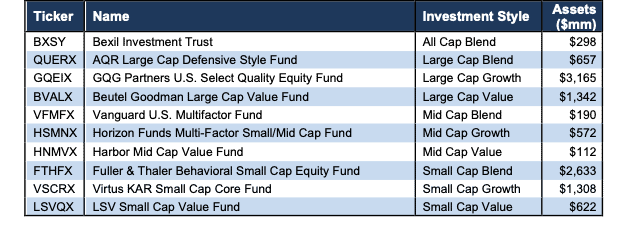 Amongst the mutual funds in Figure 1, Beutel Goodman Large Cap Value Fund (BVALX) ranks first overall, Vanguard U.S. Multifactor Fund (VFMFX) ranks second, and Fuller & Thaler Behavioral Small Cap Equity Fund (FTHFX) ranks third. AQR Large Cap Defensive Style Fund (QUERX) ranks last.