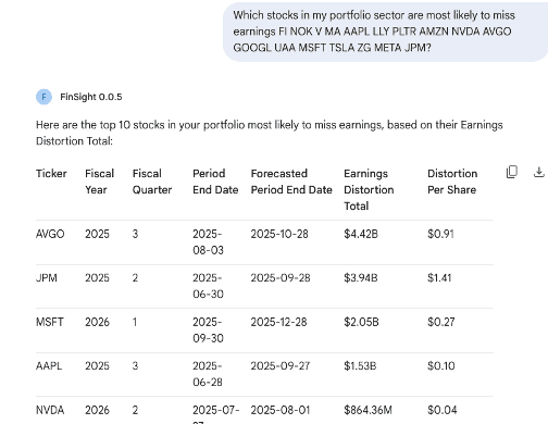 First, we show you how FinSights can scan your portfolio and tell which stocks are at the highest risk of missing consensus earnings. See Figure 2. The Core Earnings and Earnings Distortion research that powers FinSights is the same as that which drives the outperformance of our indices, as detailed above.