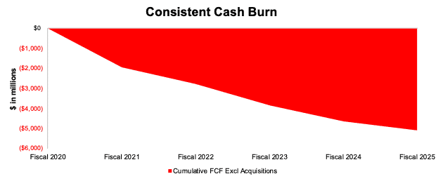 In fiscal 2025, the company burned -$425 million in FCF excluding acquisitions. From fiscal 2020 through fiscal 2025, the company burned through a cumulative $5.1 billion (18% of enterprise value) in FCF excluding acquisitions. See Figure 1.