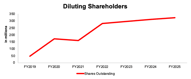 Per Figure 2, the company’s shares outstanding increased from 47 million in fiscal 2019 to 323 million in fiscal 2025.