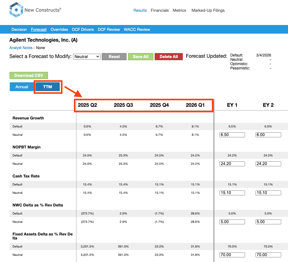TTM data also appears on an entirely new TTM data tab on the Forecast page, per Figure 2. This tab allows users to view historical TTM values (i.e. TTM ended 3Q25, TTM ended 2Q25, TTM ended 1Q25, etc.) and future forecasted values for each of the drivers in our reverse DCF model.