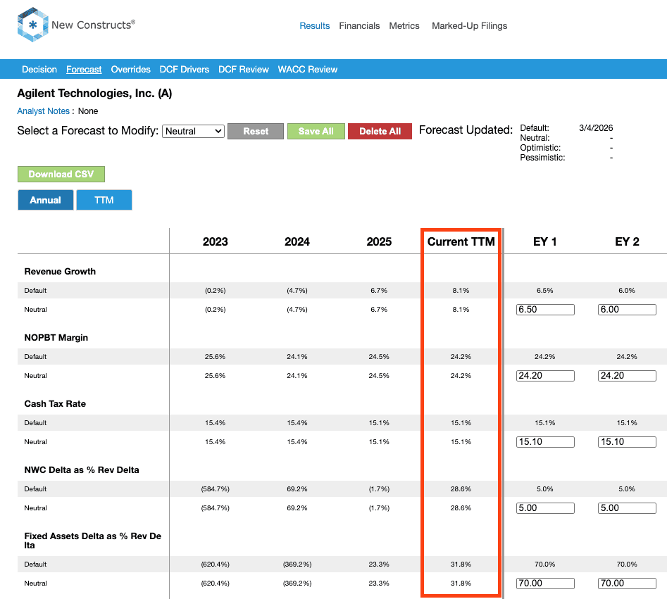 We make it easy for clients to compare the TTM values with and forecasted values while building out their DCF scenarios.