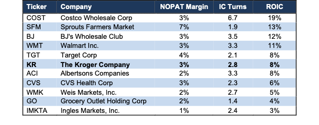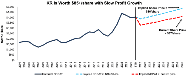 KR would be worth at least $86/share today – a 28% upside to the current price. In this scenario, Kroger’s NOPAT would grow just 2% compounded annually over the next decade. Contact us for the math behind this reverse DCF scenario.