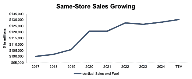 Per Figure 3, Kroger’s same-store sales excluding fuel grew from $100.2 billion in 2017 to $130.5 billion in the TTM, or 4% compounded annually.