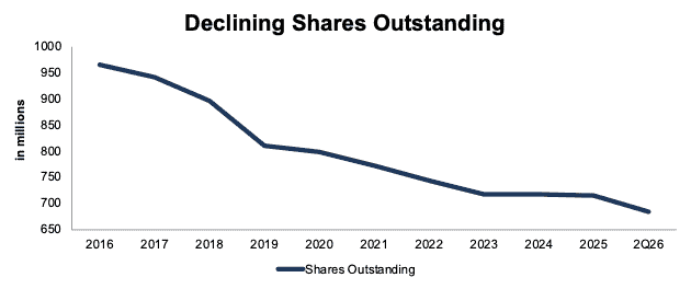 Per Figure 6, the company’s shares outstanding fell from 966 million in fiscal 2016 to 685 million in fiscal 2Q26.
