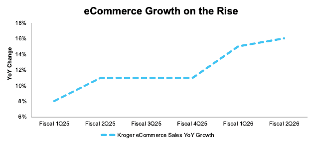 These deals should only accelerate an already fast-growing eCommerce business. Per Figure 2, Kroger has grown eCommerce sales by double digits in each of the past five quarters. Most recently, Kroger grew its eCommerce sales by 16% YoY in fiscal 2Q26 (quarter ended August 16, 2025).